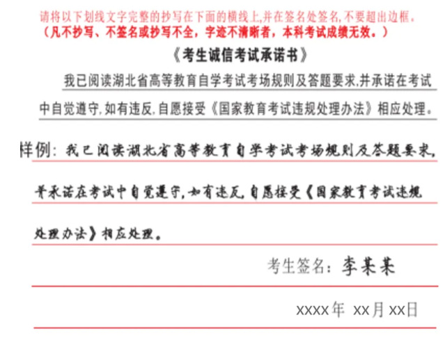 7。落实笔迹消息采集要求。考生应正在答题卡指定区域完整抄写《考生诚信测验许诺书》,凡不抄写、不签名、不填写日期或抄写不全,笔迹不清晰者,该科测验成就无效。考生结业时,省教育将对每张答题卡上的《考生诚信测验许诺书》笔迹进行复核,凡笔迹不分歧、经判定为的,将按照《国度教育测验违规处置法子》做出成就做废、延迟结业、记入国度教育测验诚信档案等处置。《考生诚信测验许诺书》抄写样例如下图。